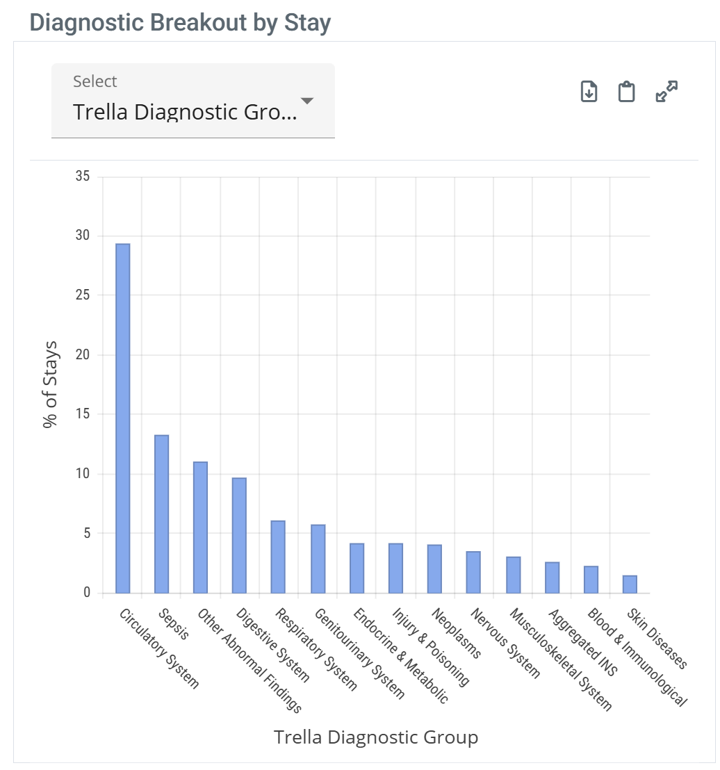 - Diagnostic Breakout by Stay - counts of patient stays by Trella Health Diagnostic Group or MS-DRG for HHA patients discharged from the selected facility.