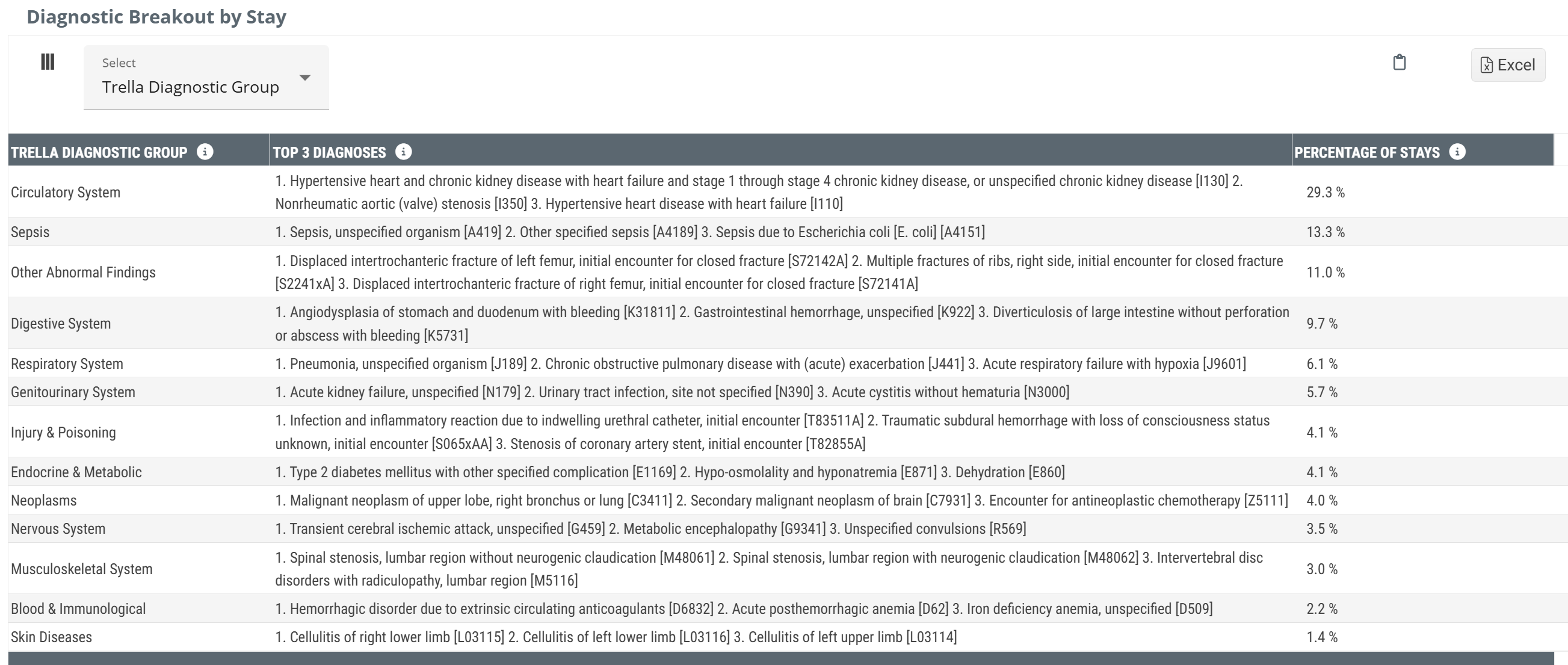 This column lists the top three diagnoses (based on the primary ICD-10-CM diagnosis code) for patients treated by the the selected skilled nursing facility that fall within the listed Trella diagnostic group. All of the Trella Health Diagnostic Groups have far more diagnosis codes. Use these as a general guideline. For details, see the article listed below. |