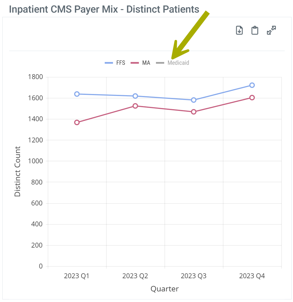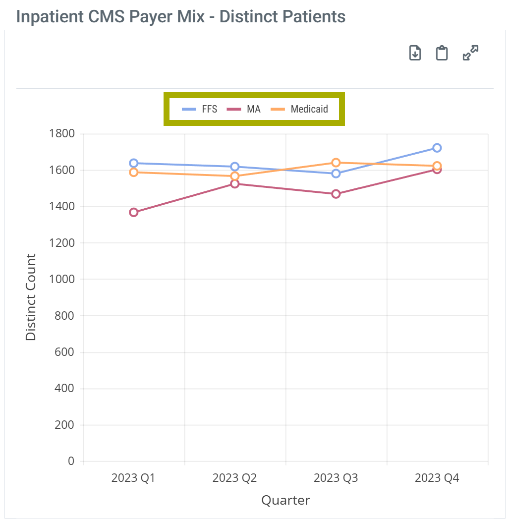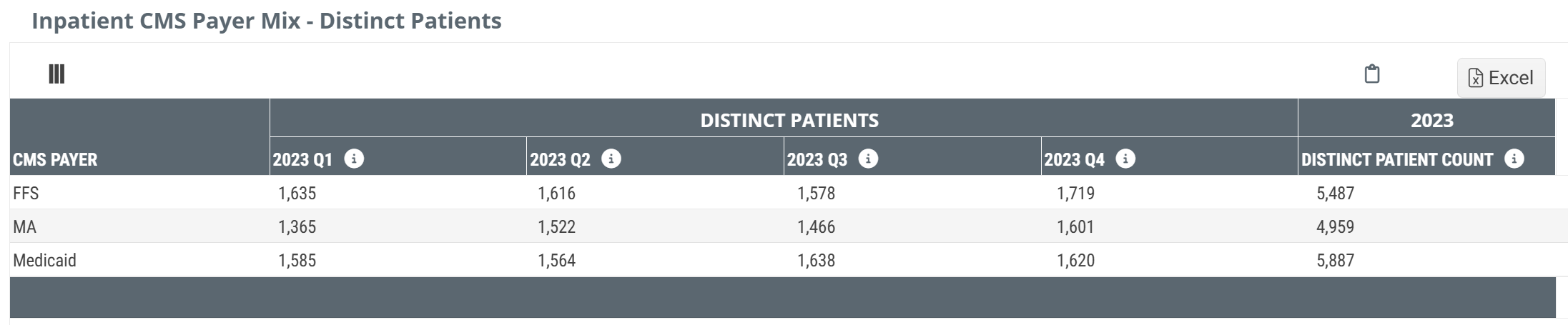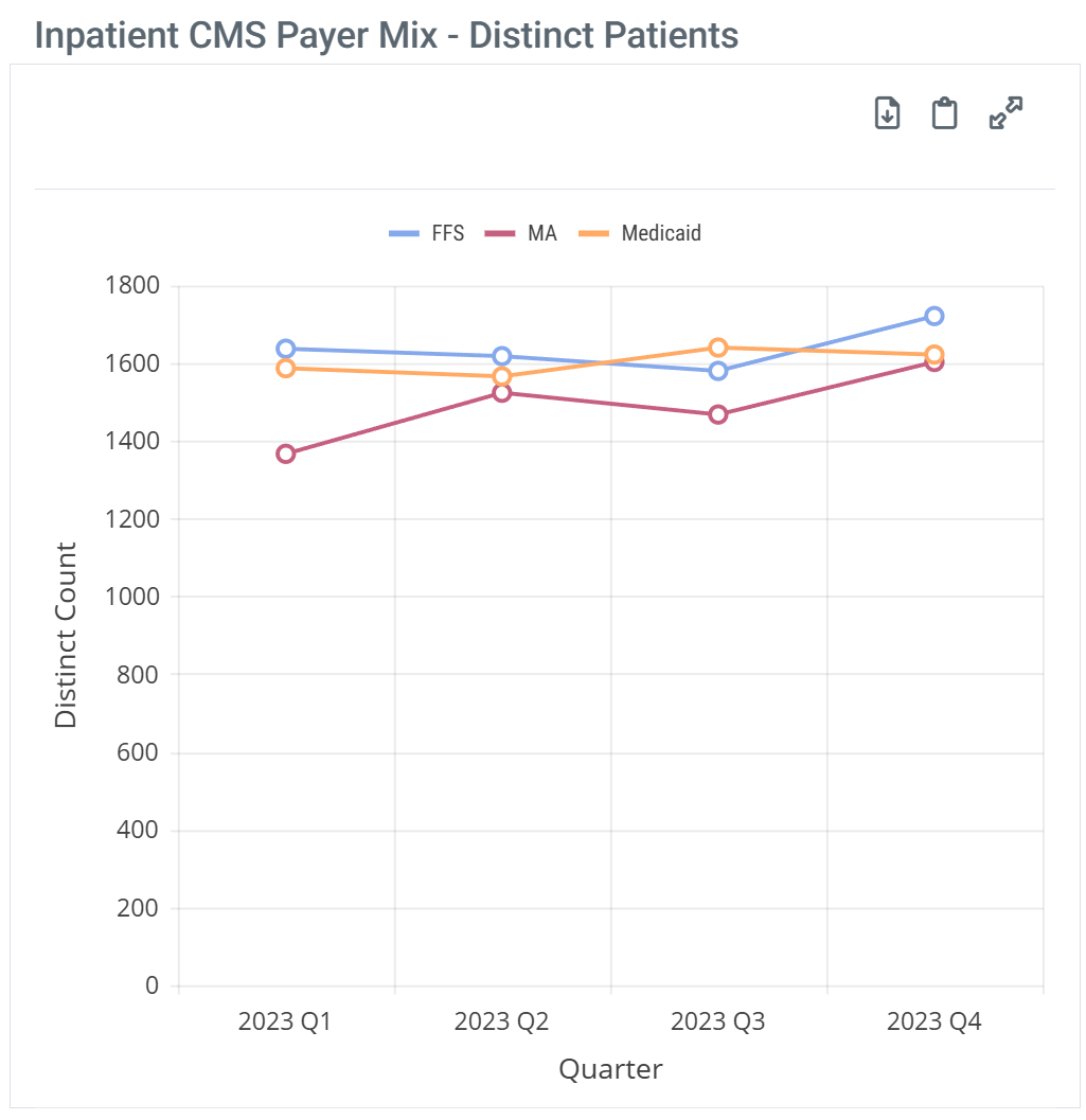 - Inpatient CMS Payer Mix - Distinct Patients - inpatient patient counts for Medicare FFS, Medicare Advantage, and Medicaid discharged from the selected facility