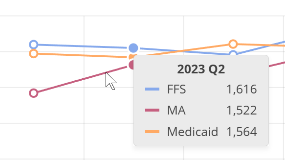 | When you hover over a line in the Outpatient CMS Payer Mix chart, the metrics for the different patient counts represented in the column are displayed. | ![]() |