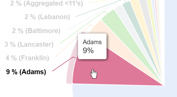 | When you hover over a sector in the Patient Location - County chart, the metrics for that sector are displayed. | ![]() |