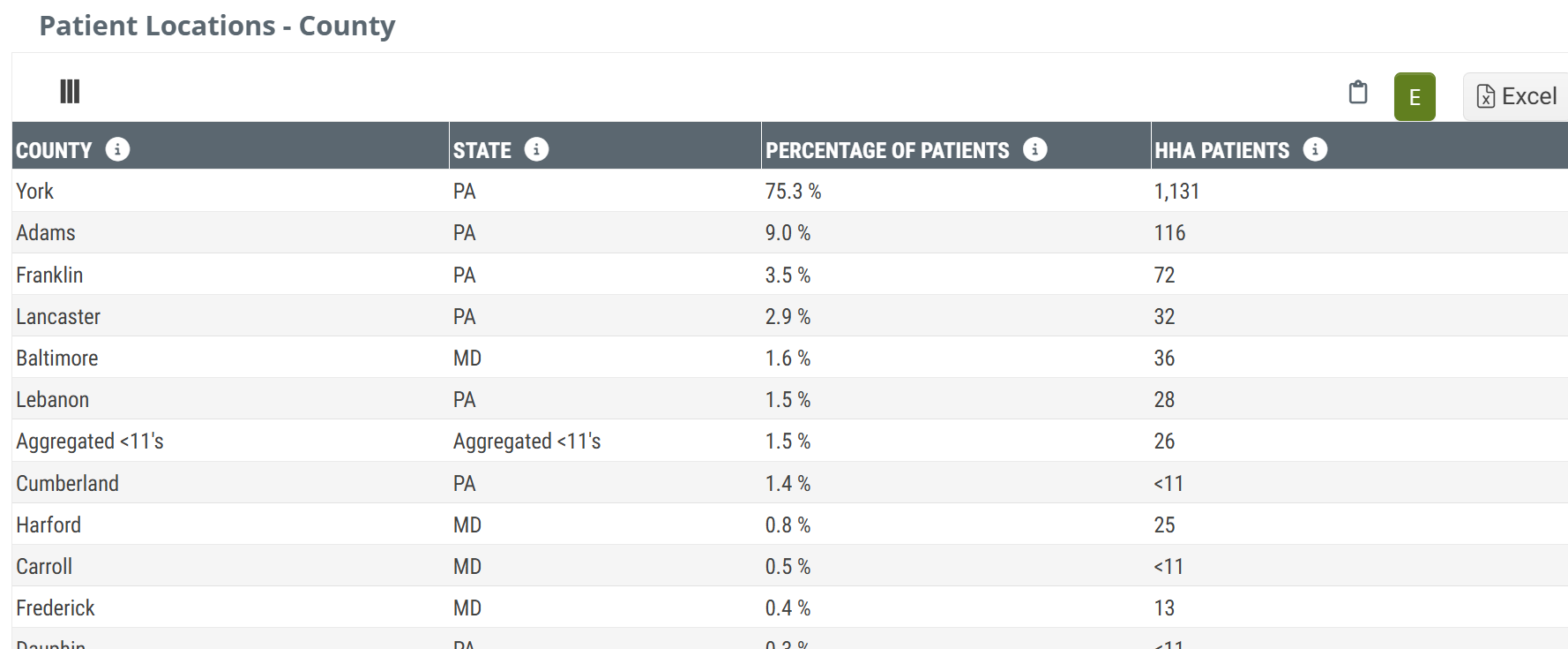 Since these metrics are based on the patients' place of residence, it is possible to have counties from states other than the state of the facility's location. This will be especially true for facilities located in smaller states or near state lines. Those "out of state" counties will only be included in this table if there is a sufficient count of patients.